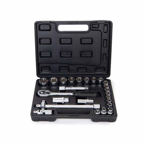 - 24 piece 1/2" drive socket set including sockets in 8, 9, 10, 11, 12, 13, 14, 15, 16, 17, 18, 19, 20, 22, 24, 27, 30 32mm.