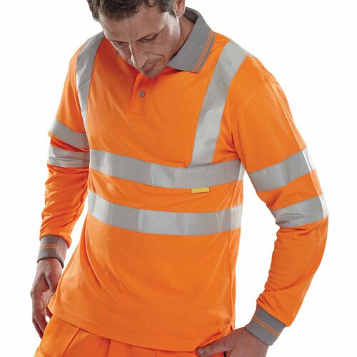 - Long Sleeve Polo Shirt in 100% polyester knit fabric in high viz orange with reflective banding