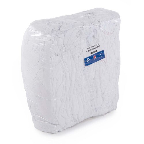 • Bulk bag of general purpose white silk free textile recycled cleaning rags in a 10KG compressed bale